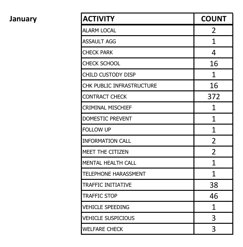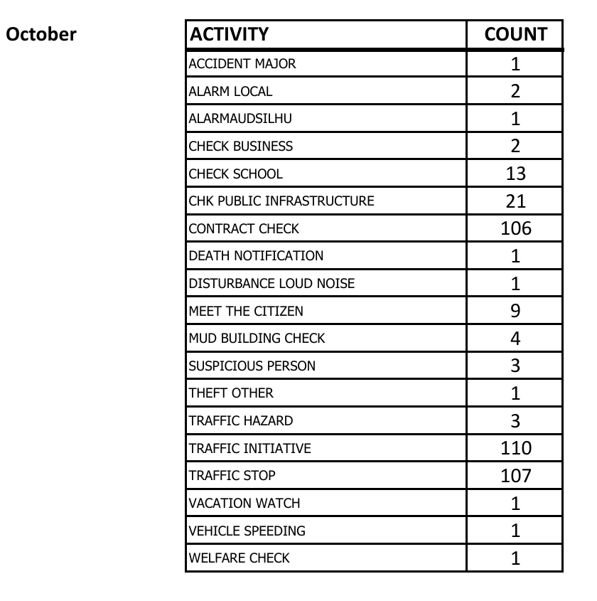 As a courtesy to our residents, the HOA is posting below an extract from the latest HCSO monthly report of the activities that occurred within the Settlement and a link to the year-to-date figures of that same information beginning with 2023.